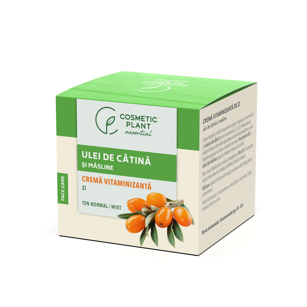 Crema vitaminizantă de zi cu ulei de cătină şi măsline hrăneşte şi fortifică tegumentul graţie complexului vitaminizant al uleiului de cătină (conține vitaminele A, E, F și D). Neutralizează radicalii liberi şi stimulează capacitatea naturală de autoapărare a pielii împotriva agresiunii zilnice a factorilor de mediu. Provitamina B5 şi uleiul de măsline asigură o hidratare intensă şi durabilă.