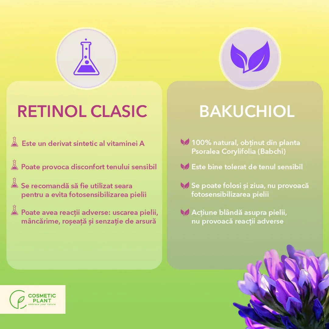 Bakuchiol 99% puritate = Natural Retinol*, alternativa vegetală a retinolului, obținut din planta Psoralea corylifolia, cunoscută sub denumirea de Babchi. Bakuchiol-ul stimulează sinteza de colagen (tip I, III și IV), cu efect anti-ageing.