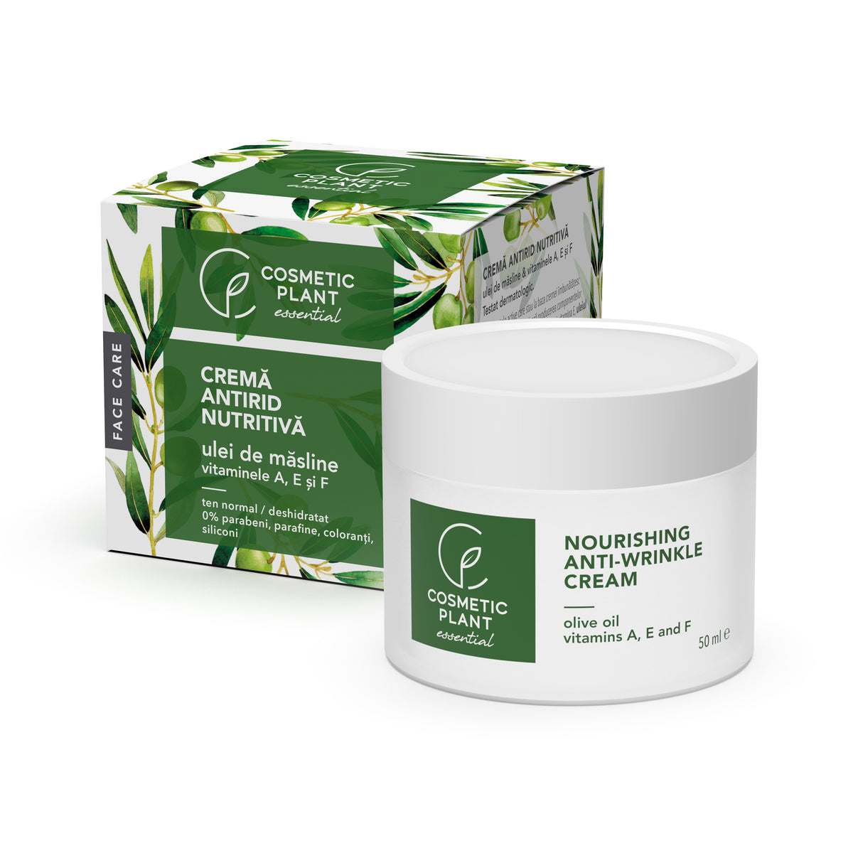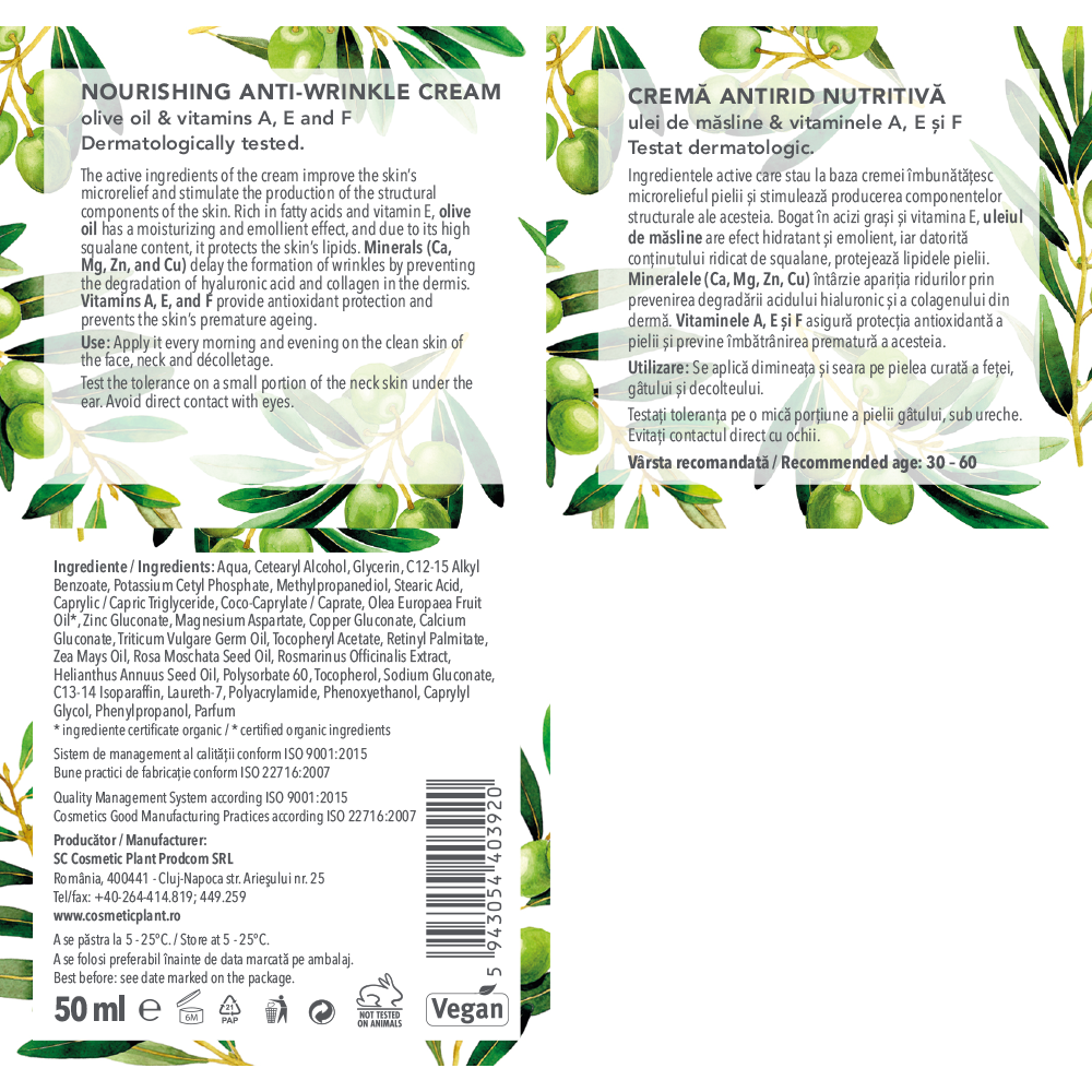 Crema antirid nutritivă cu ulei de măsline și vitaminele A, E și F combină acțiunea emolientă a uleiului de măsline cu acțiunea anti-îmbătrânire a complexului de vitamine A, E și F.