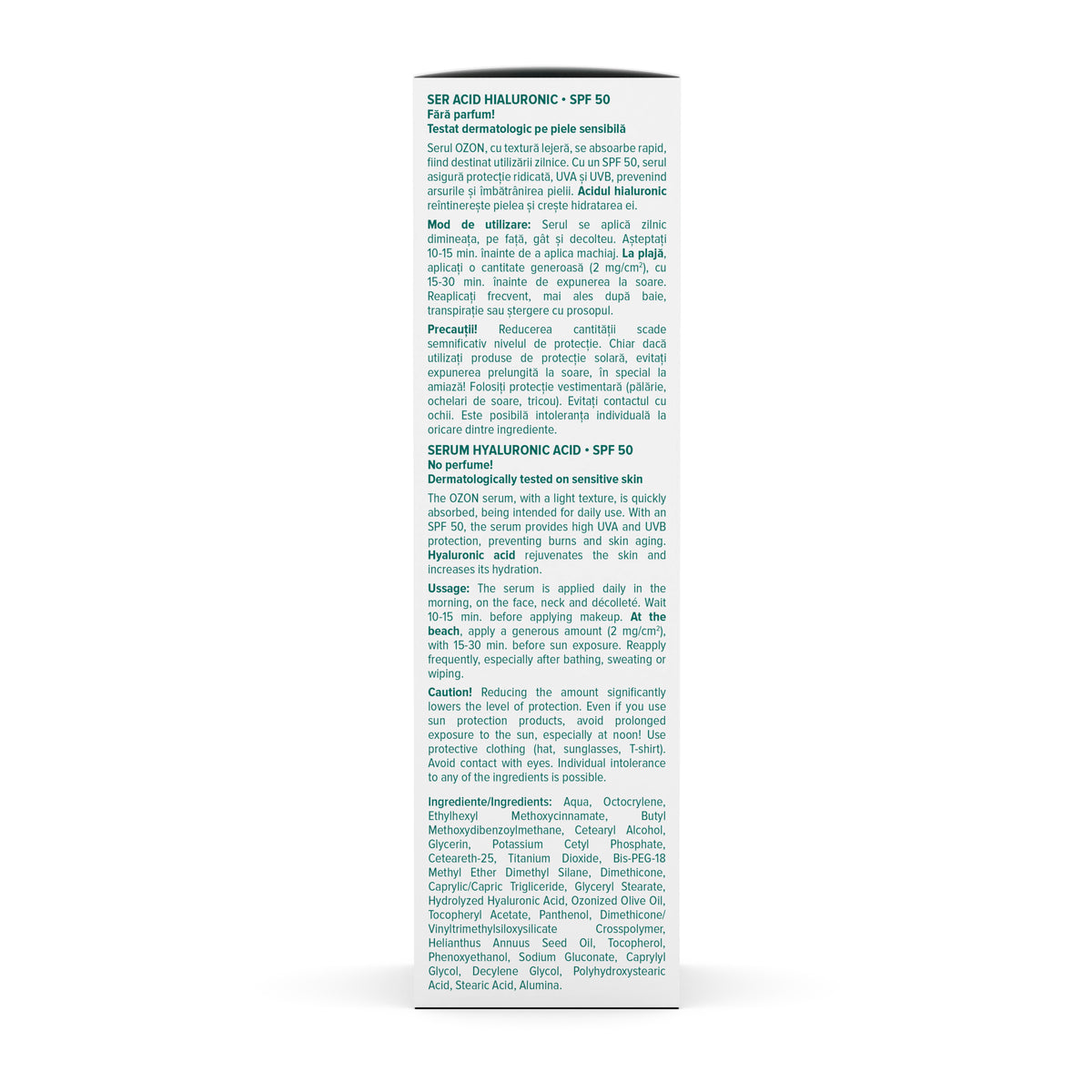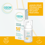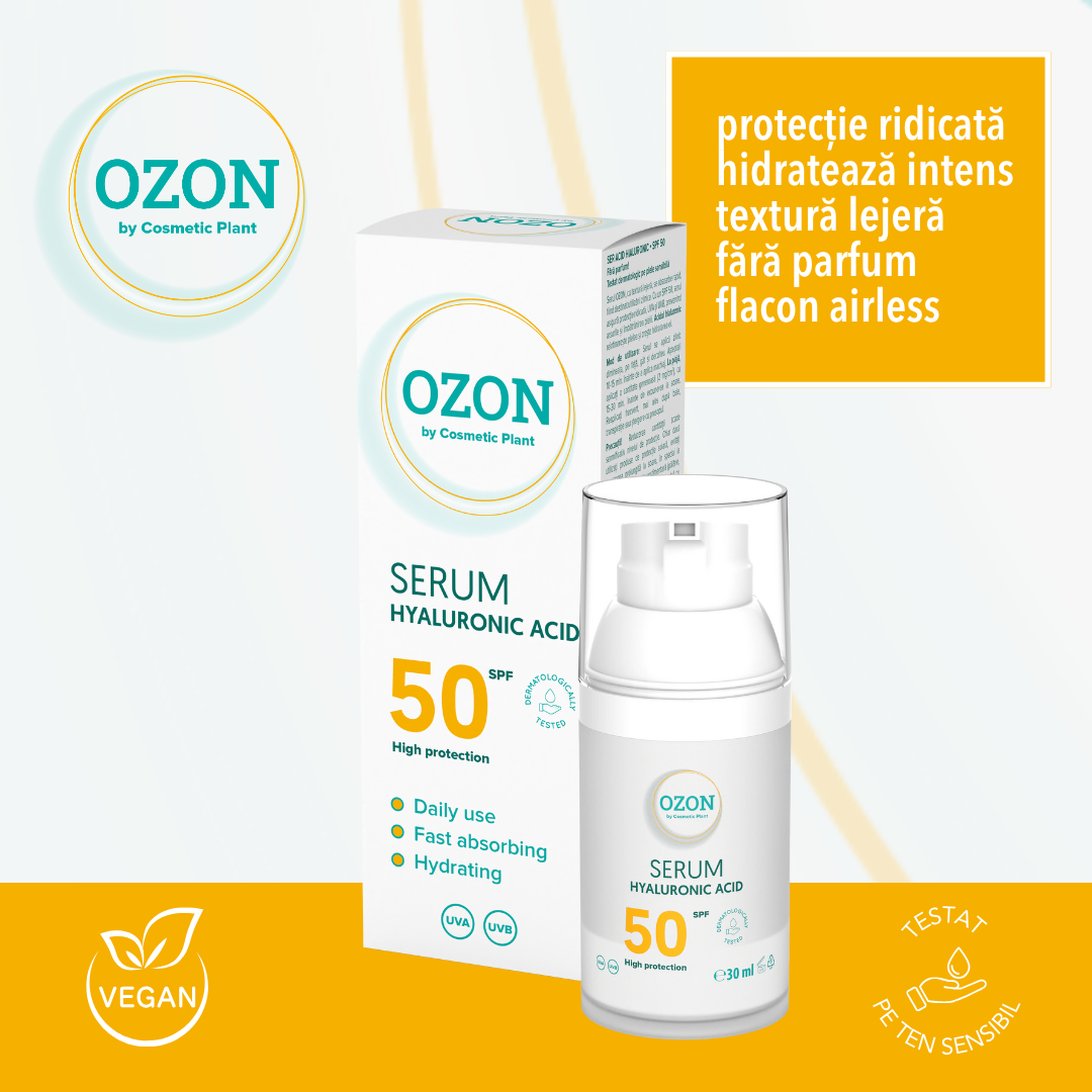 Serul OZON, cu textură lejeră, se absoarbe rapid, fiind destinat utilizării zilnice. Cu un SPF 50, serul asigură protecție ridicată, UVA și UVB, prevenind arsurile și îmbătrânirea pielii.