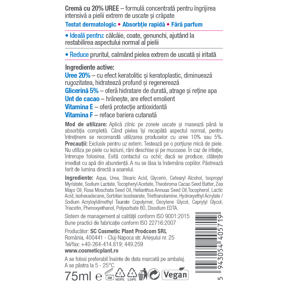 Uree 20% – cu efect keratolitic și keratoplastic, diminuează rugozitatea, hidratează profund și regenerează