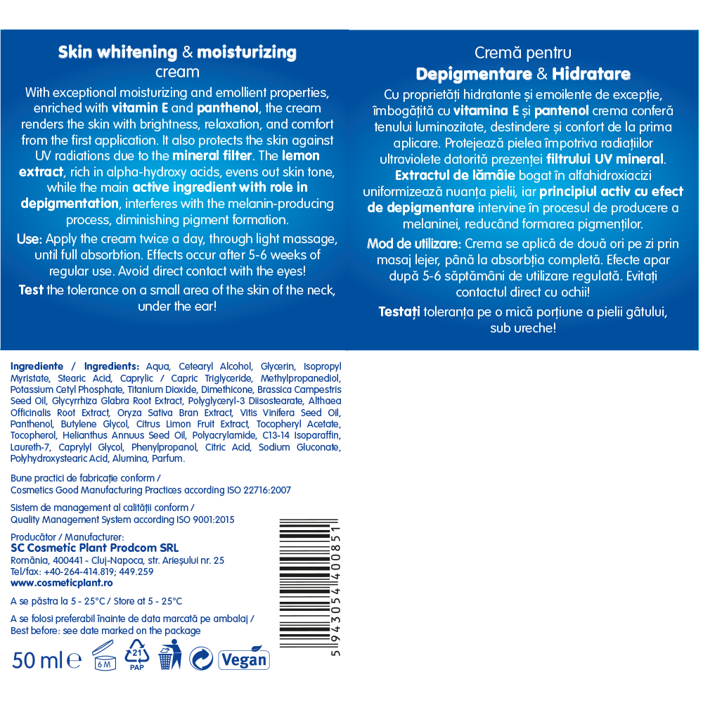Cu proprietăţi hidratante şi emoliente de excepţie, îmbogăţită cu vitamina E si pantenol, crema pentru depigmentare-hidratare Me&Mom conferă tenului luminozitate, destindere şi confort de la prima aplicare. Protejează pielea împotriva radiaţiilor ultraviolete datorită prezenţei filtrului UV mineral.