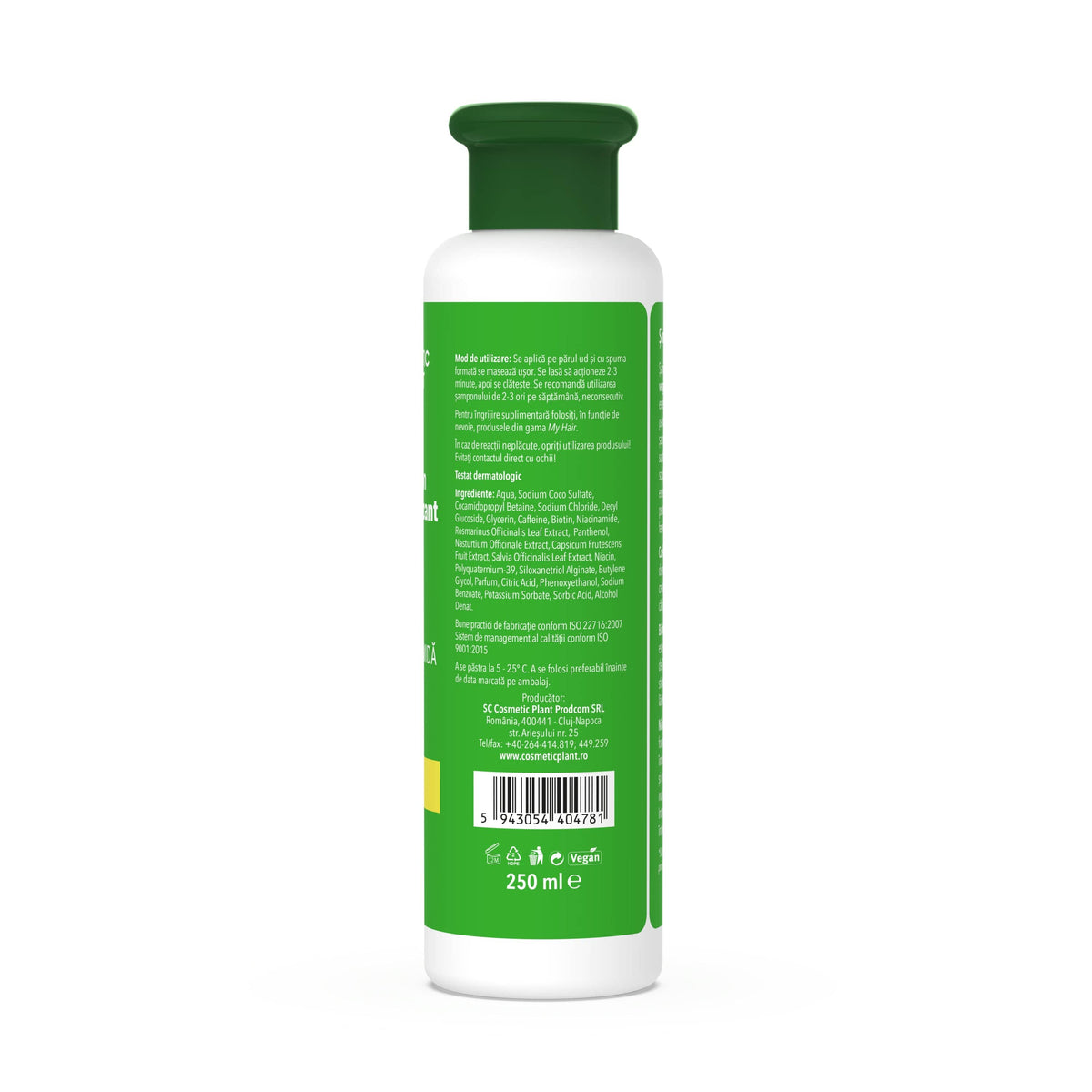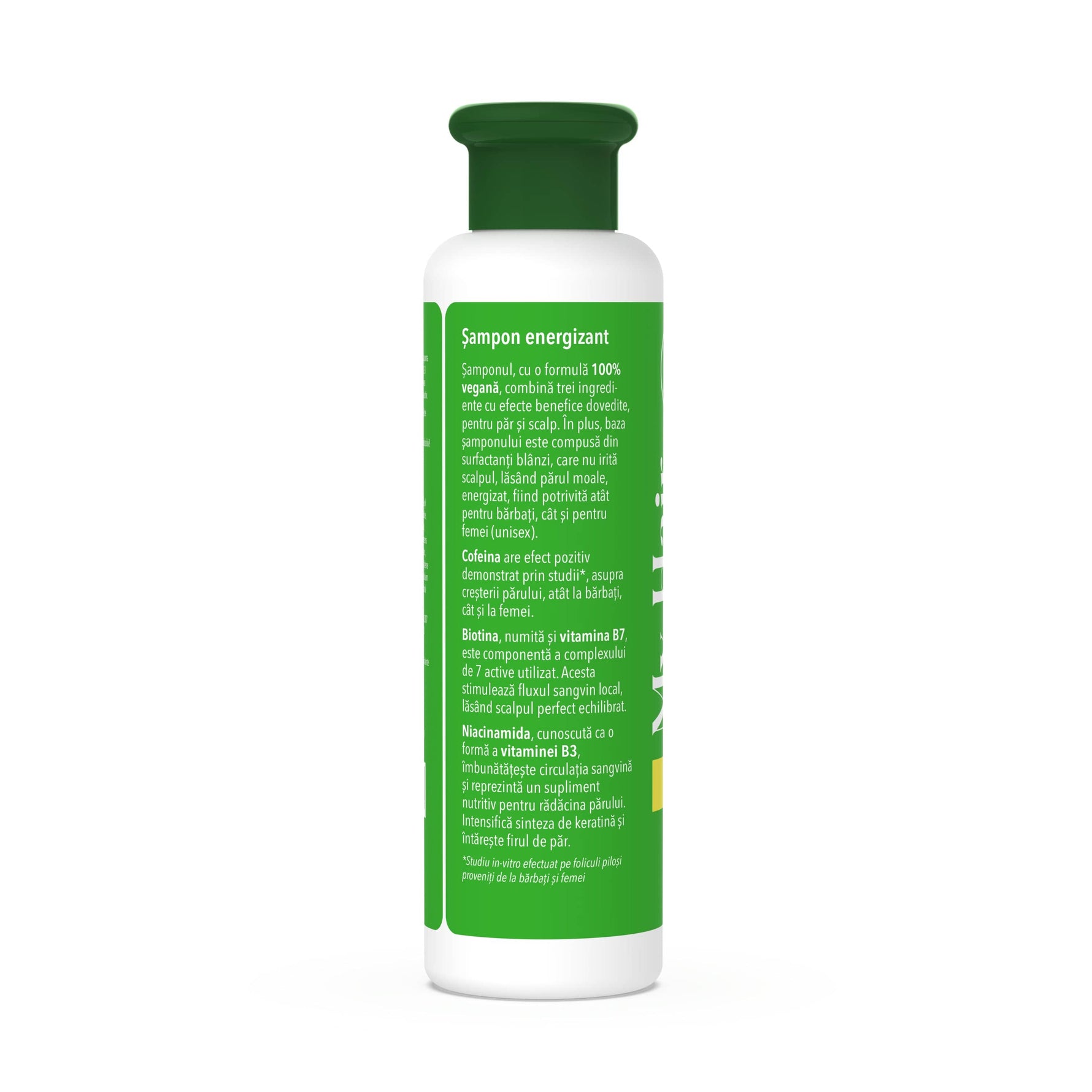 Șamponul, cu o formulă 100% vegană, combină trei ingrediente cu efecte benefice dovedite pentru păr și scalp. În plus, baza șamponului este compusă din surfactanți blânzi, care nu irită scalpul, lăsând părul moale, energizat, fiind potrivită atât pentru bărbați, cât și pentru femei (unisex).