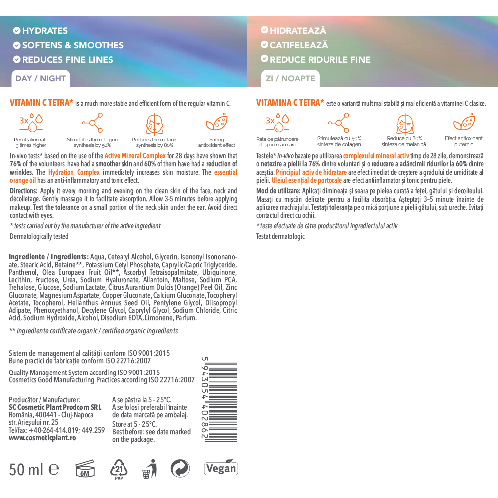 Vitamina C Tetra, o formă stabilă și foarte eficientă a vitaminei C clasice, are efect antioxidant, pătrunde mai ușor în stratul adânc al pielii, unde stimulează sinteza colagenului. Protejează împotriva efectelor radiațiilor UV și a radicalilor liberi care duc la îmbătrânirea prematură a pielii.