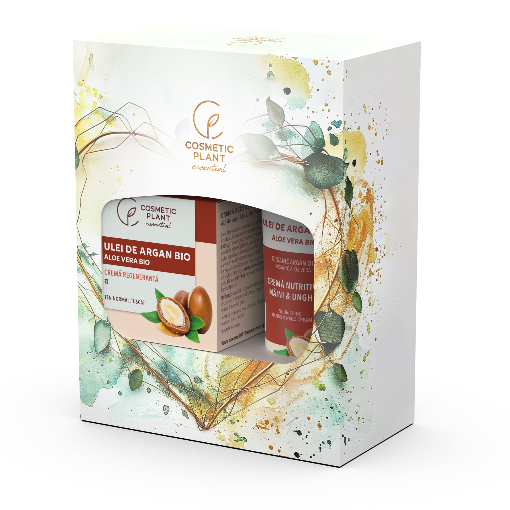Set cadou Essential - Cremă regenerantă de zi cu ulei de argan bio 50 ml + Cremă nutritivă mâini și unghii cu ulei de argan bio 100 ml