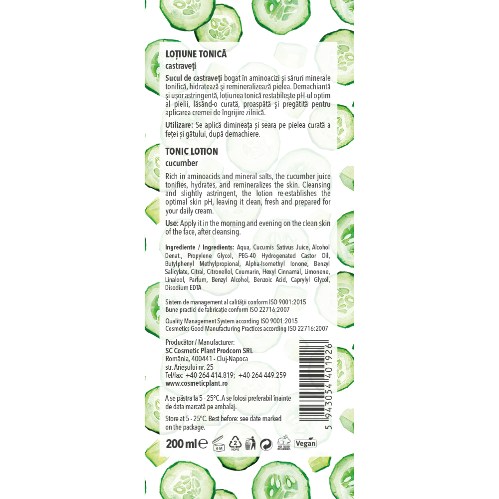 Loţiune tonică cu suc de castraveţi conține suc de castraveţi bogat în aminoacizi şi săruri minerale, care tonifică, hidratează şi remineralizează pielea.
