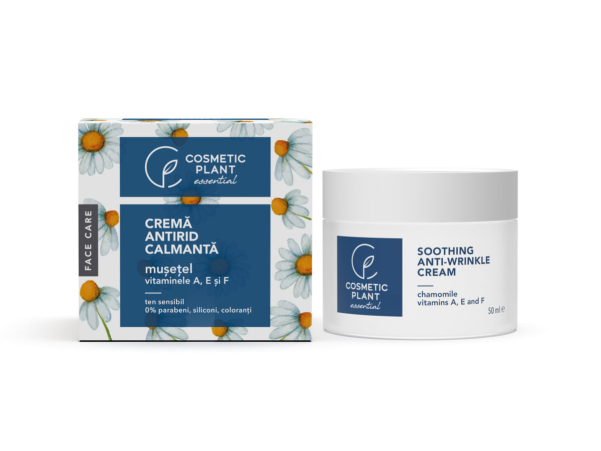 Crema antirid calmantă cu extract de mușețel și vitaminele A, E și F combină efectele extractului de mușețel cu cele ale vitaminelor liposolubile A, E și F.