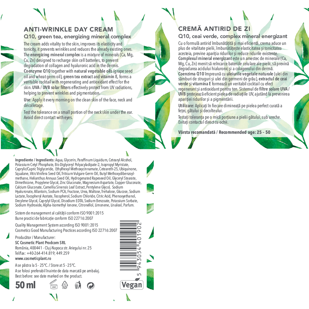 Cremă antirid de zi Q10 + ceai verde și complex mineral energizant