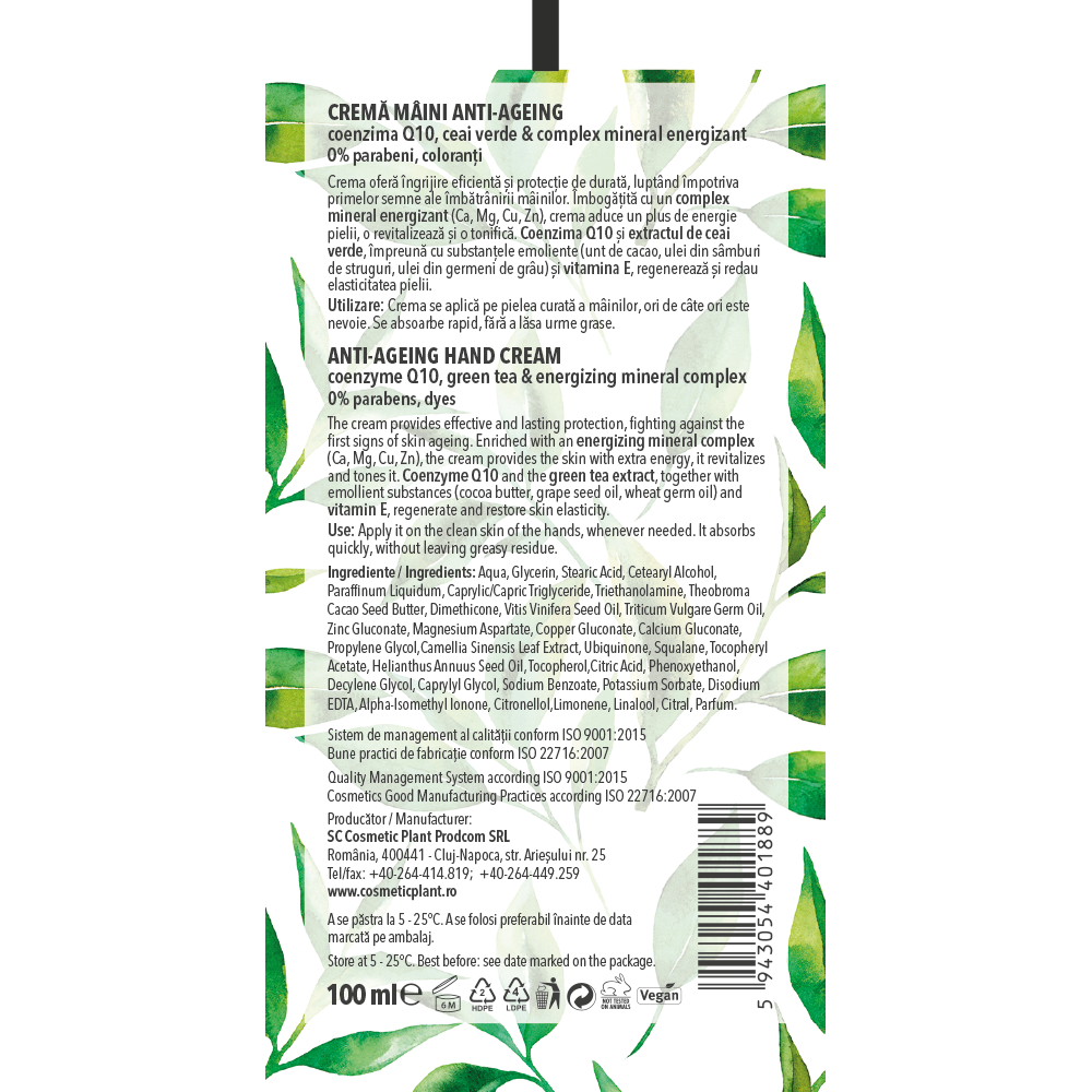 Cremă mâini anti-ageing Q10 + ceai verde și complex mineral energizant