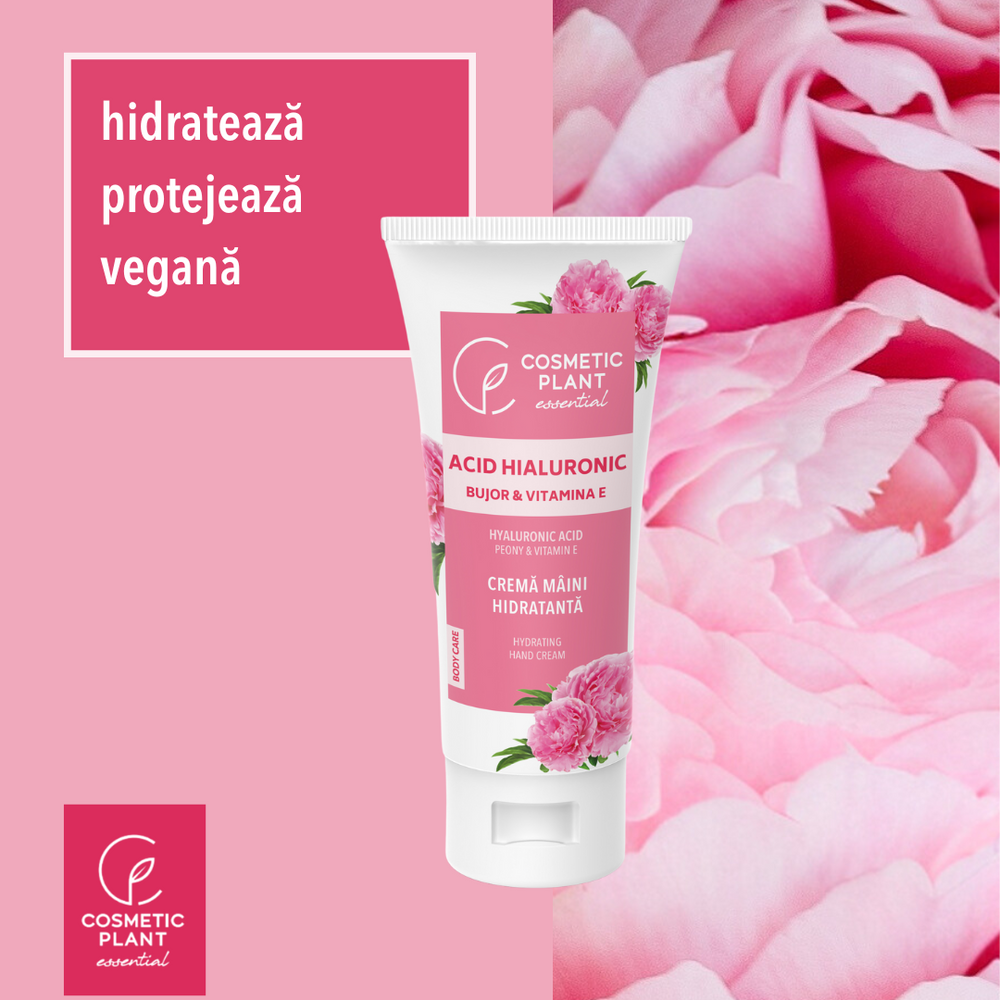 Cremă mâini hidratantă cu acid hialuronic, bujor & vitamina E