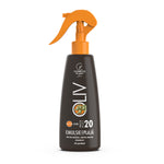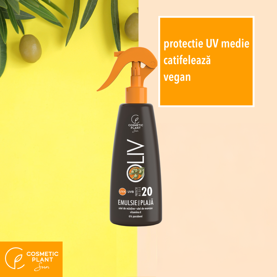 Emulsia pentru plajă OLIV cu ulei de morcov şi măsline - SPF 20 protejează epiderma de arsurile solare graţie conţinutului în filtre UVA / UVB. Uleiul de morcov bogat în carotenoide accelerează bronzarea. Uleiul de măsline este emolient, iar vitamina E neutralizează radicalii liberi responsabili de îmbătrânirea prematură.