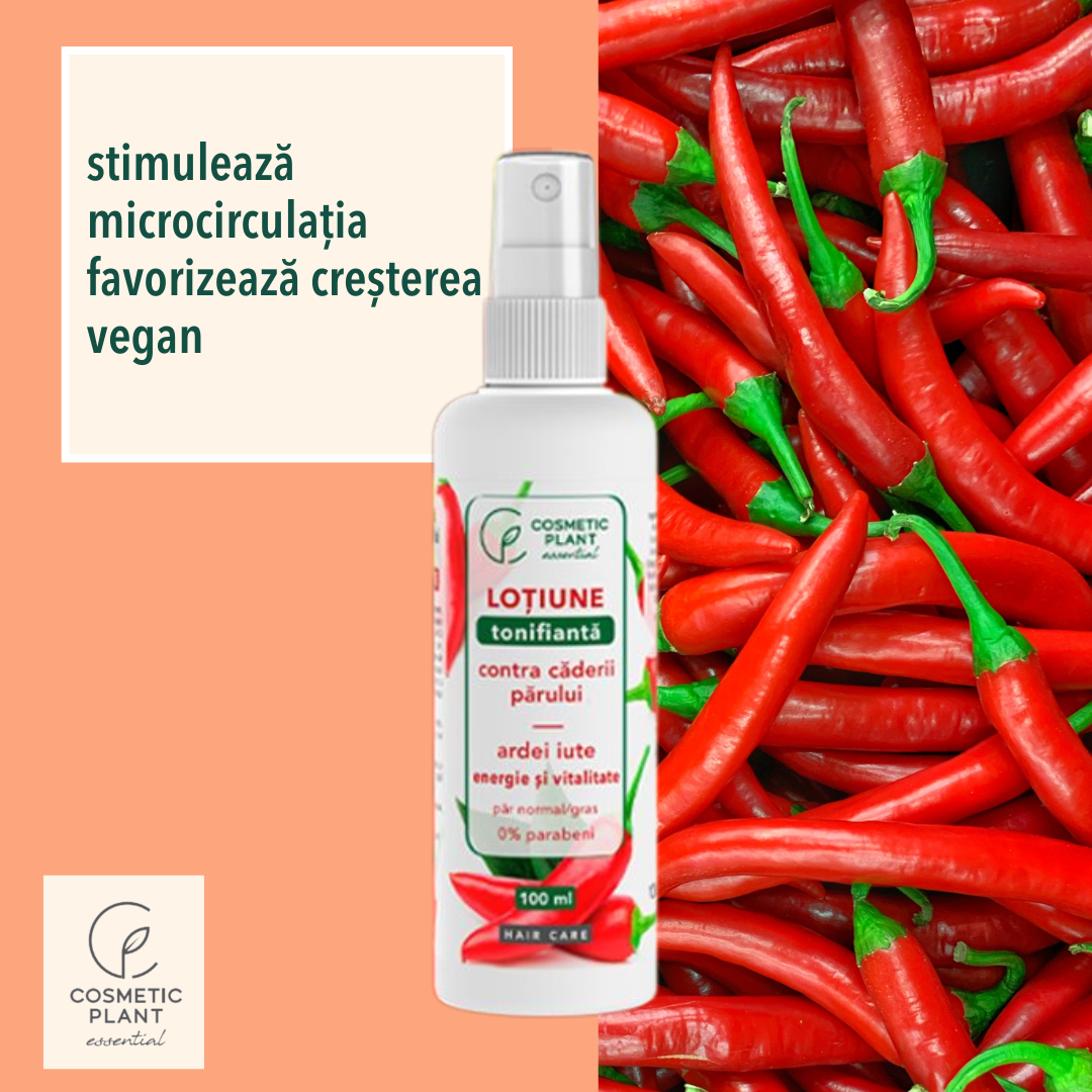 Principiile active din frunze de nuc, rozmarin, coada calului, mesteacăn şi extractul de ardei iute activează circulaţia sanguină, tonifică scalpul, hrăneşte rădăcina firului de păr, favorizând creşterea acestuia. Extractele de urzică şi rădăcină de brusture sunt recunoscute pentru efectul antimătreaţă şi de îngrijire a scalpului. Astfel, Loţiunea tonifiantă contra căderii părului cu ardei iute poate reduce inflamația şi mâncărimea la nivelul scalpului.